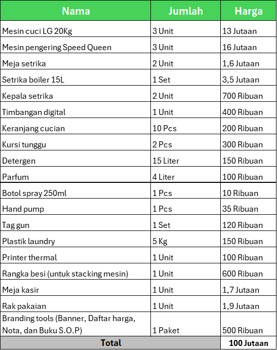 Buat kamu yang ingin memulai usaha laundry kiloan skala kecil atau hanya dari rumah saja, dengan modal 15 jutaan saja, kamu sudah bisa membuka usaha laundry kiloan yang proper dan lengkap dengan layanan setrika nya juga. Berikut rinciannya.