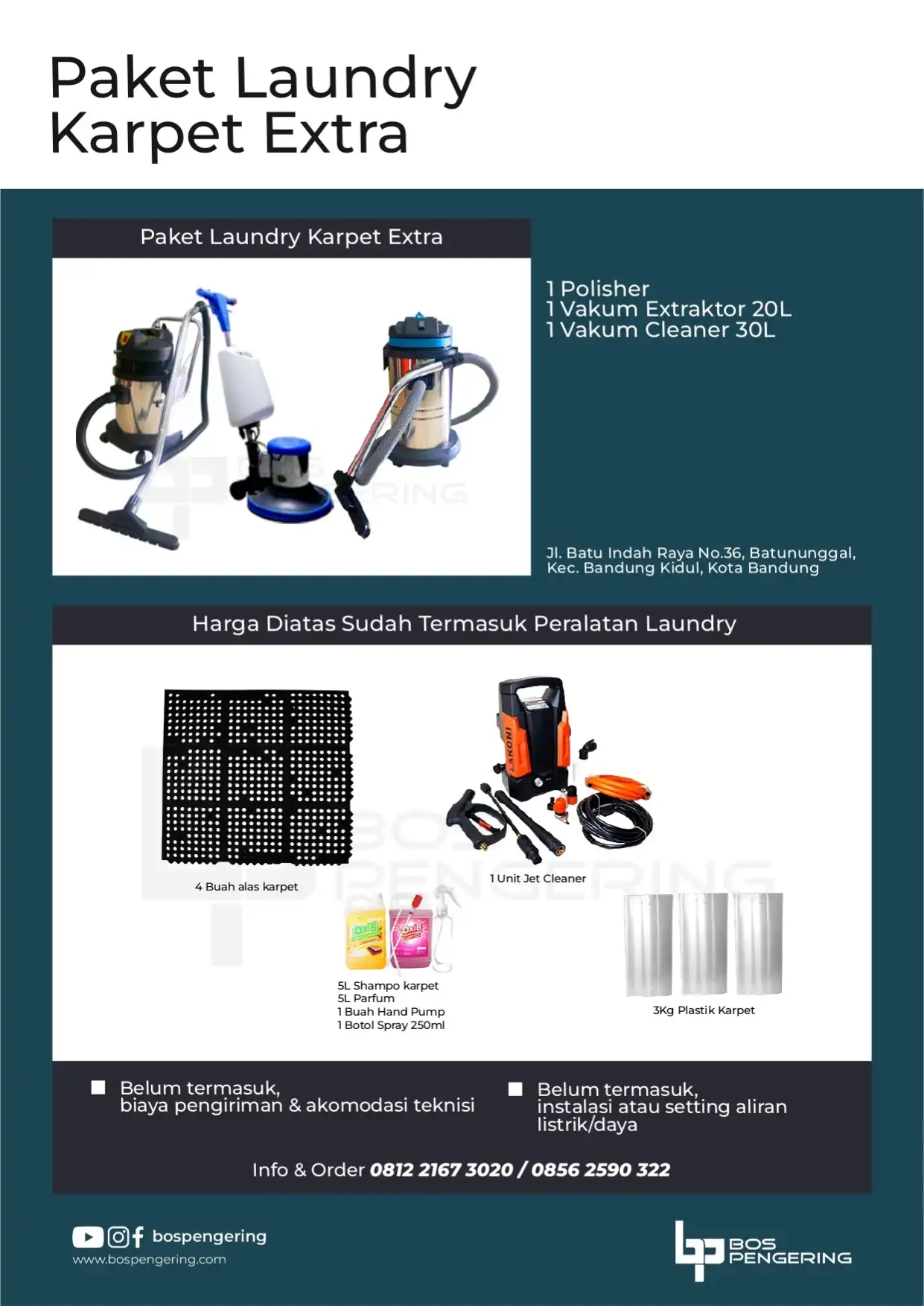 Lengkapi usaha laundry Anda dengan paket mesin dan perlengkapan khusus laundry karpet, siap membantu Anda melayani pelanggan skala rumah tangga hingga bisnis.