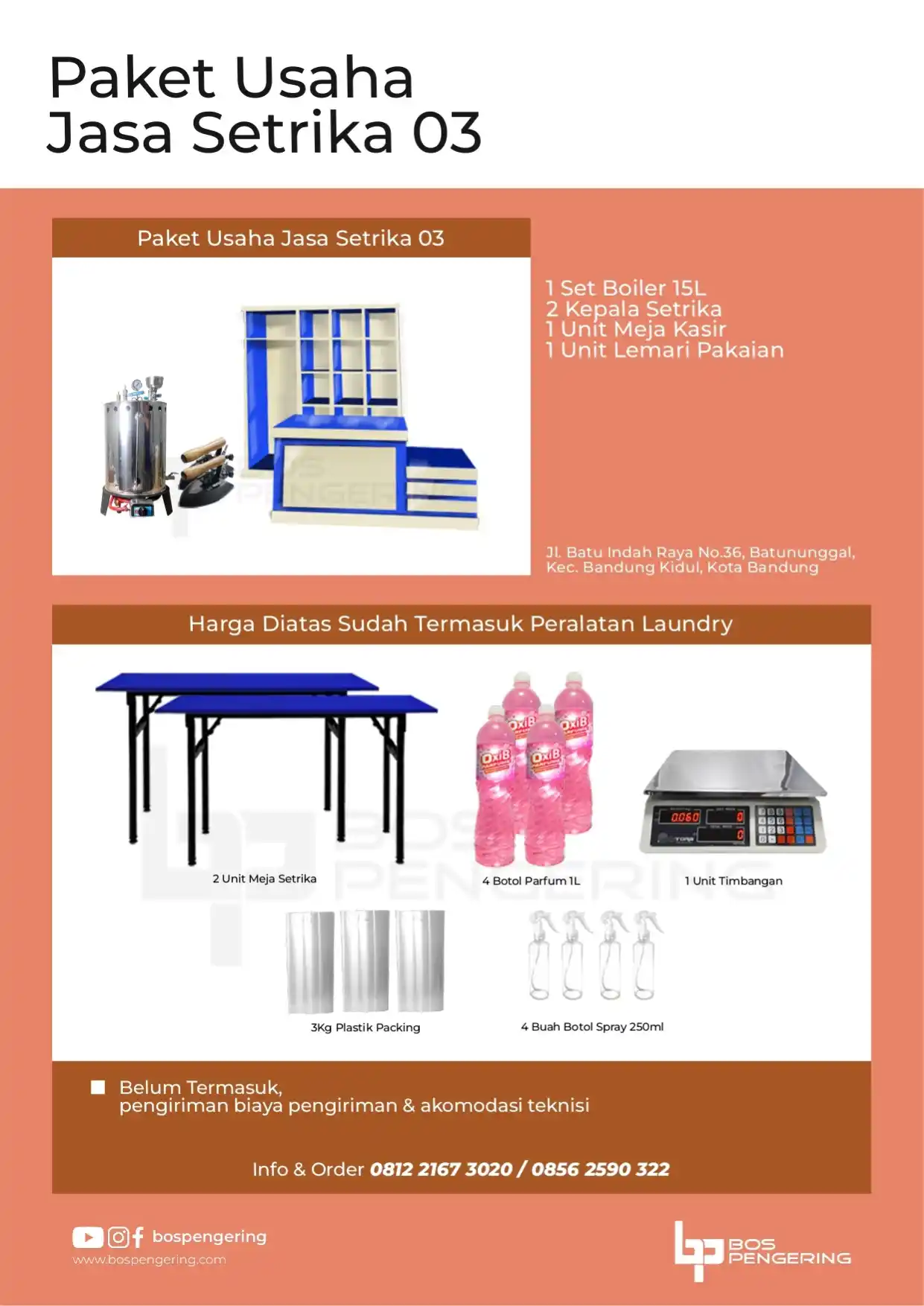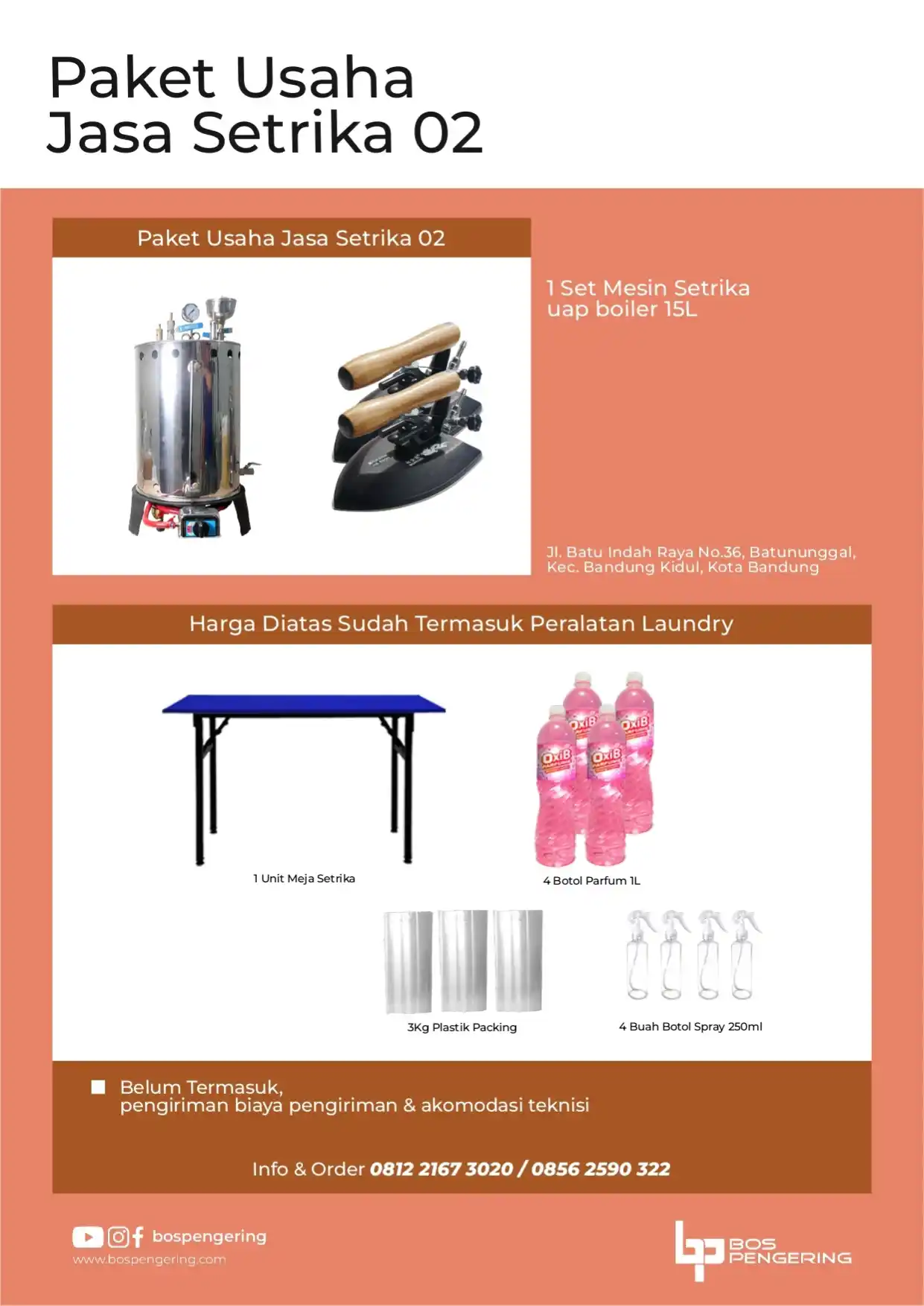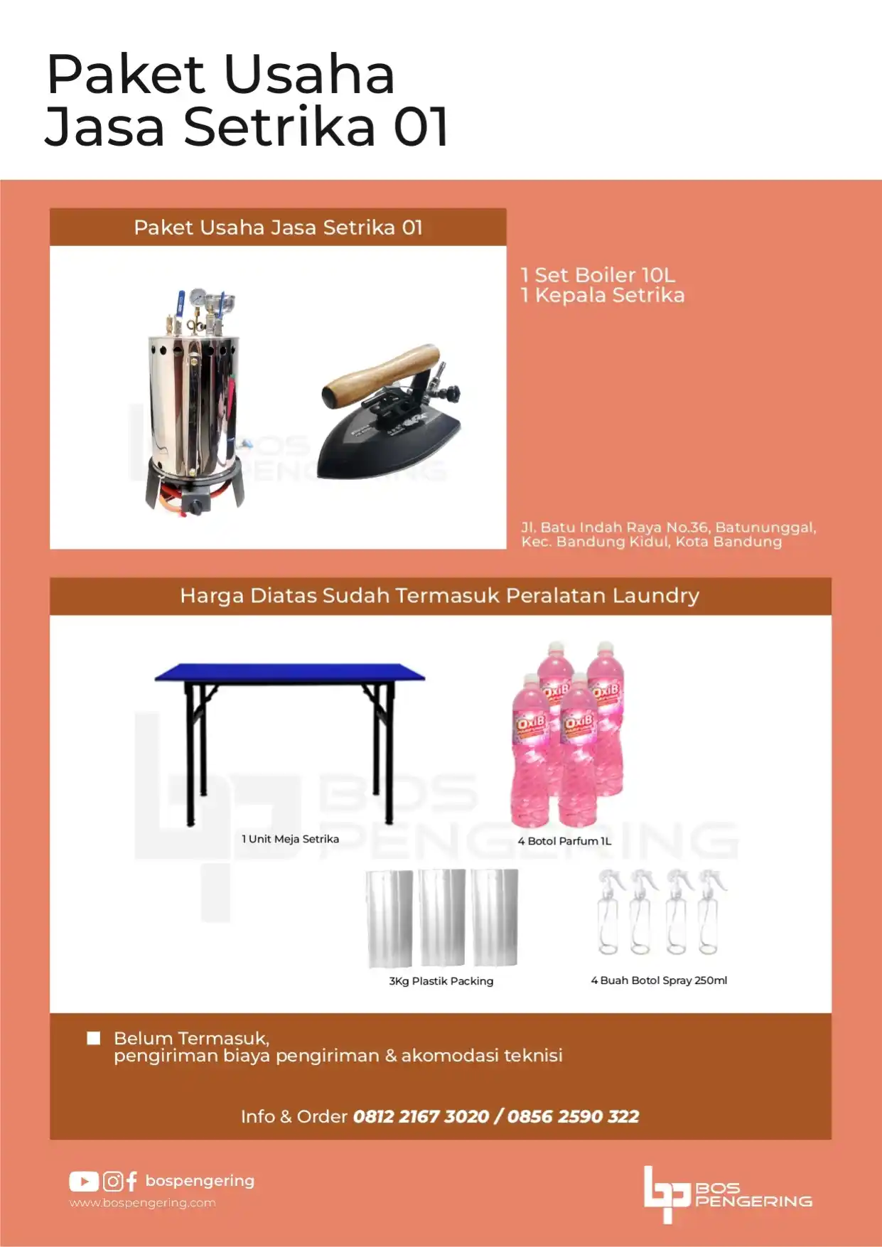Solusi bagi pengusaha laundry atau rumahan yang ingin membuka layanan setrika profesional. Paket sudah termasuk perlengkapan Setrika Uap Boiler, meja, rak, dan kebutuhan lainnya agar usaha langsung jalan.
